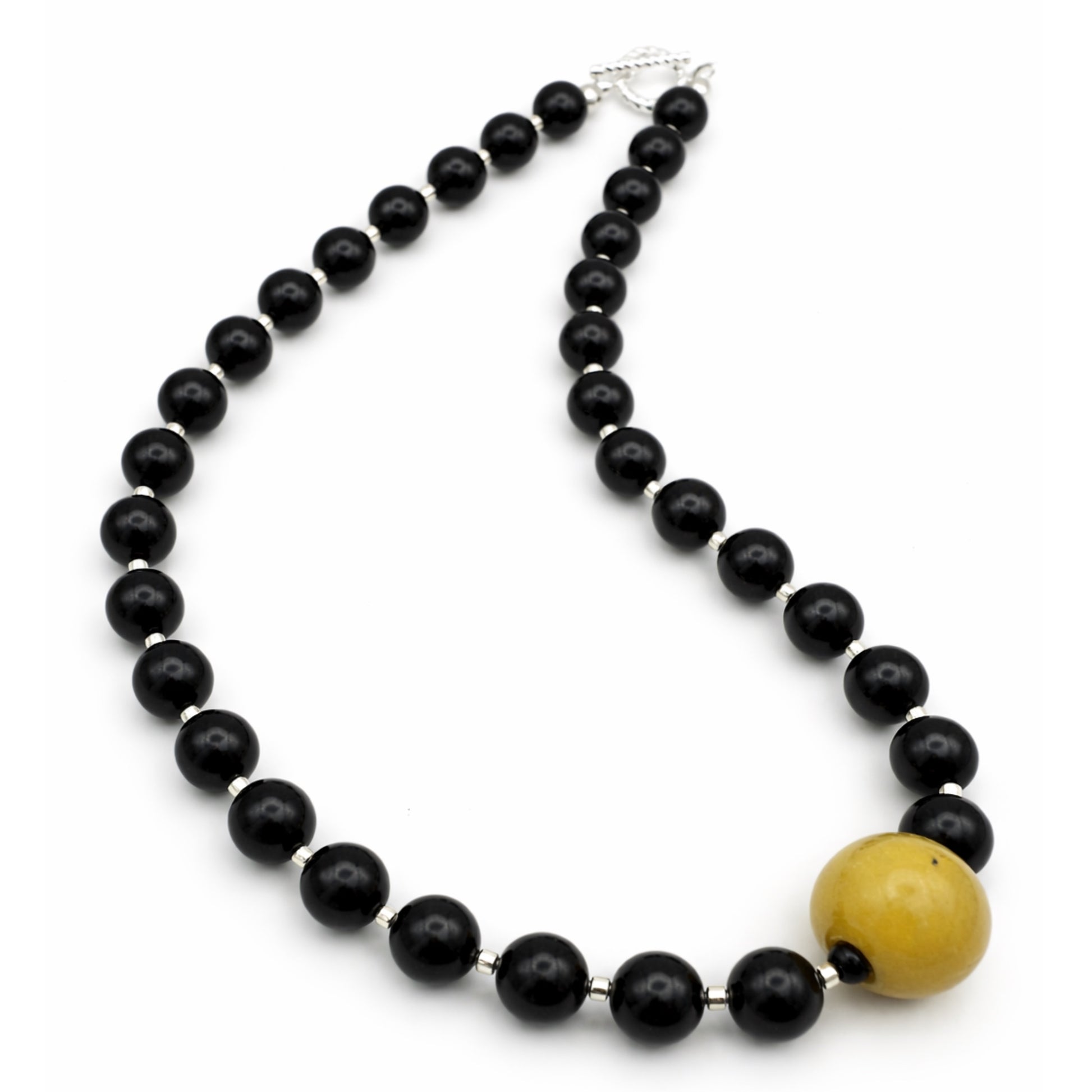 Alexandra is a striking yet understated necklace designed to ground and centre. Hand-strung with smooth black obsidian beads, the piece is anchored by a rare mustard-toned Chinese wound glass bead, dating to the early 20th century. Measuring approximately 17.5–20mm, this opaque yellow focal bead brings warmth, history, and depth to the design.