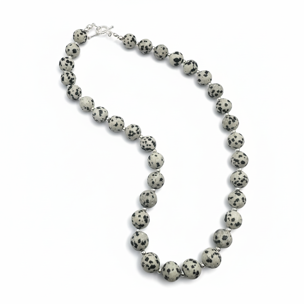 Softly speckled and naturally distinctive, Lila is a modern classic designed for effortless, everyday wear. Handcrafted with smooth round Dalmatian Jasper beads, each stone features its own organic patterning in muted stone and ink-black tones — a quiet statement of individuality.