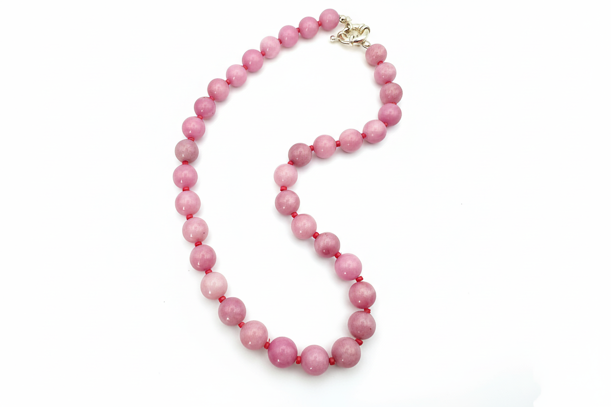 The Valentina necklace features hand-selected beads that transition through varying shades of rose, blush, and deep pink. The natural variations in the Jade ensure that your piece has a unique, organic character.